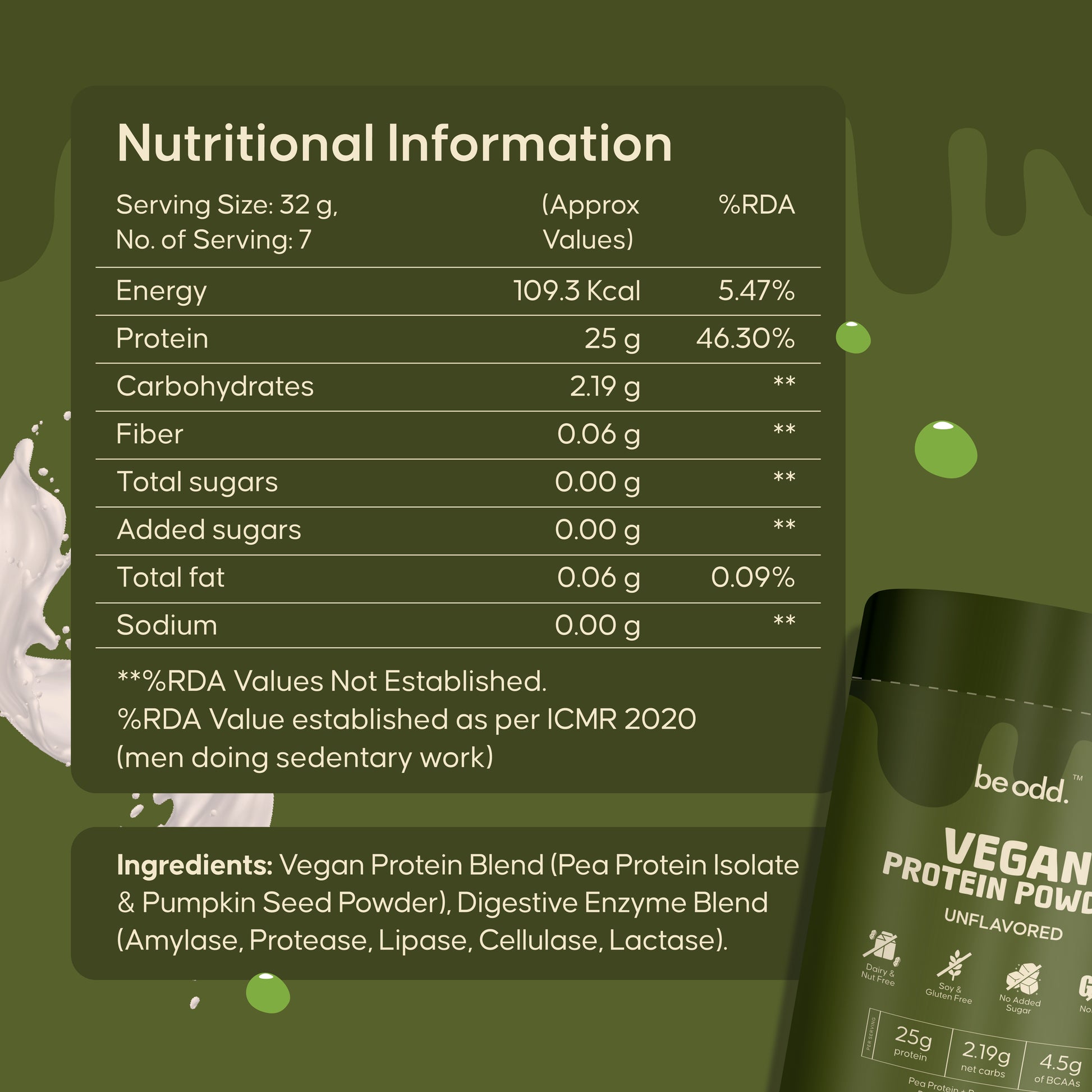 Be Odd provides 25g protein + 4.5g BCAAs per scoop, which helps repair muscles faster after activity. Recovery speed depends on your diet and activity level, but compared to regular plant proteins, our enzyme blend supports quicker absorption and better recovery.