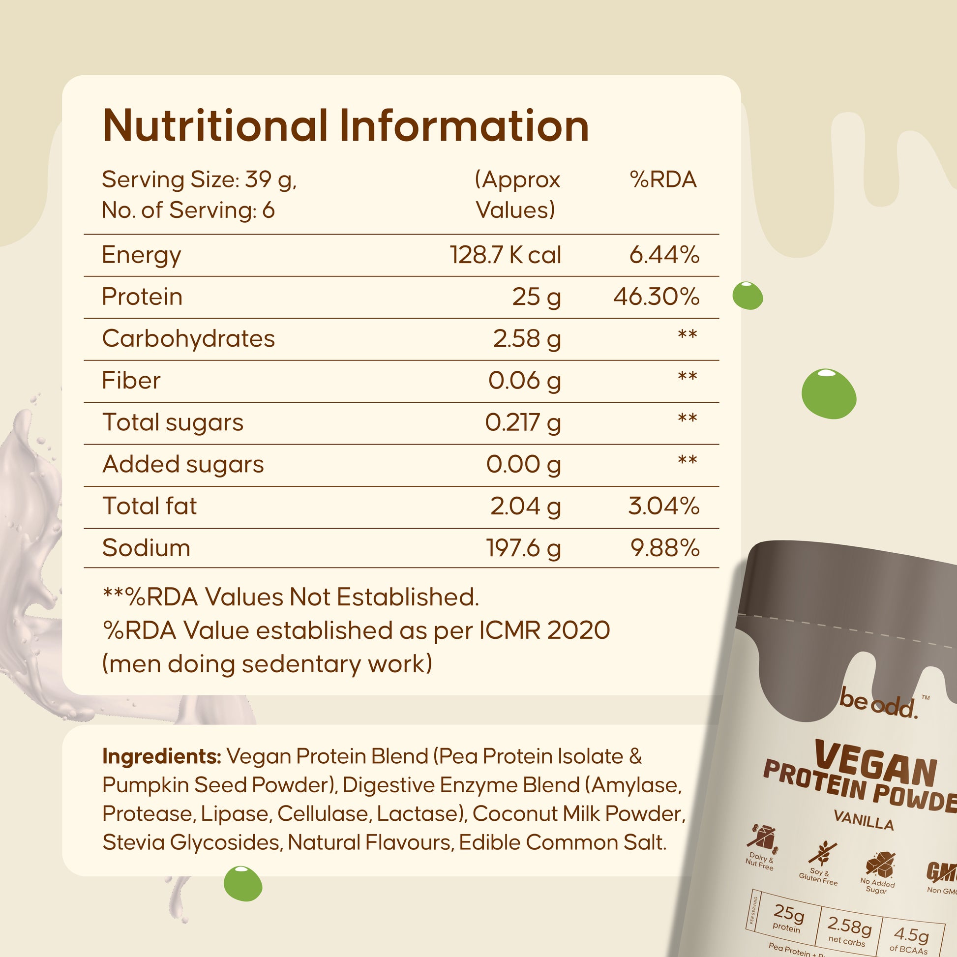 Be Odd provides 25g protein + 4.5g BCAAs per scoop, which helps repair muscles faster after activity. Recovery speed depends on your diet and activity level, but compared to regular plant proteins, our enzyme blend supports quicker absorption and better recovery.